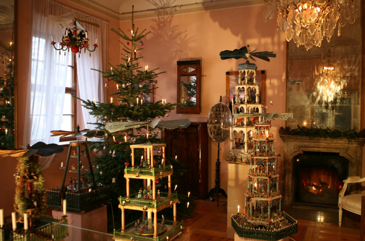 "Schie war de Peremet, bluß giehe tat se net!" Die Erzgebirgische Weihnachtstadtion steht dieses Jahr im Fokus der Weihnachtsausstellung im Landschloss Zuschendorf. Findige Bastler, welche mit wachen Augen die in den Bergwerken und im Zuge der frühen Industrialisierung des Erzgebirges die dort verwandte Technik beobachteten, schufen schon Anfang des 19. Jahrhunderts die ersten Drehtürme. Durch Rübölampen und später Kerzen wird die Luft erwärmt, die durch das aufsteigen ein Flügelrad in Bewegung setzt. Da dieses über eine Achse mit den Drehtellern verbunden ist, fangen Männel und Tiere an zu laufen. Durch die oft pyramidale Form dieser Türme hat sich die eigentlich etwas irreführende Bezeichnung Pyramide oder auf erzgebirgisch Peremet durchgesetzt.